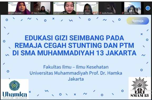 “Permasalahan gizi pada remaja seperti gizi kurang dan lebih akan meningkatkan resiko menderita penyakit khususnya penyakit tidak menular di usia lanjut dan resiko melahirkan anak stunting, ” Hal ini disampaikan Nia Musniati, SKM., MKM. Dosen kesehatan masyarakat FIKES UHAMKA dalam sebuah kegiatan Webinar diselenggarakan oleh Tim PKM Dosen Fakultas ilmu-ilmu kesehatan universitas Muhammadiyah prof. DR. Hamka (FIKES UHAMKA) Bersama dengan SMA Muhammadiyah 13 Jakarta pada Minggu Akhir Juli lalu.