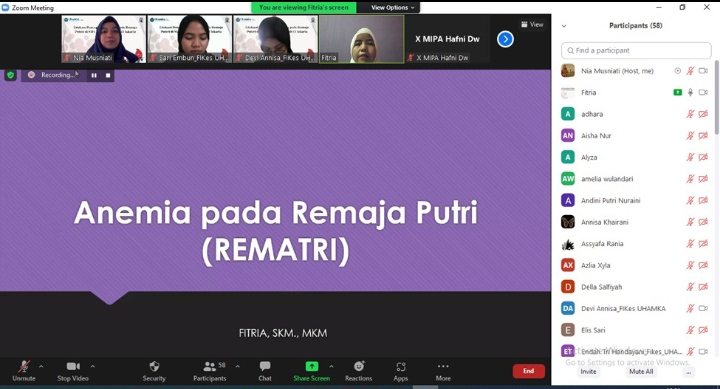 Kegiatan PKM ini dilakukan dalam upaya pencegahan anemia pada remaja putri dengan menggelar kegiatan webinar bagi siswi SMA Muhammadiyah 13 Jakarta pada Minggu (26/12) dengan beberapa Narasumber diantaranya Fitria, S.K.M., M.K.M dan Fildzah Badzlina S.Gz., M.K.M., dosen ilmu Gizi, beserta Nia Musniati S.K.M., M.K.M. dosen kesehatan masyarakat FIKES UHAMKA.