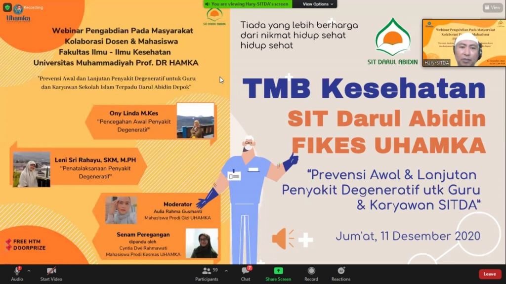 Dosen dan Mahasiswa Fakultas Ilmu-ilmu Kesehatan (FIKES) Universitas Muhammadiyah Prof. DR. HAMKA atau UHAMKA tuut berkolaborasi dalam menyelenggarakan kegiatan pengabdian kepada masyarakat. Kegiatan ini dilaksanakan dalam bentuk webinar pada hari Jum’at melalui online virtual zoom meeting (11/12/21).